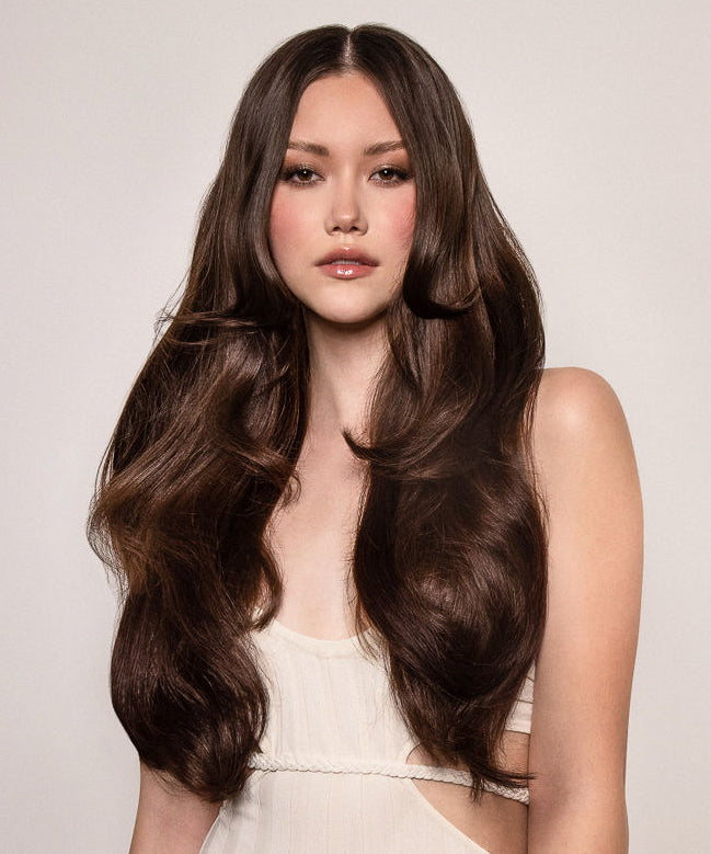 Result achieved with 5 packs of Hand-Tied Wefts in Bitter Sweet and Double Espresso, using the Push-Up method.